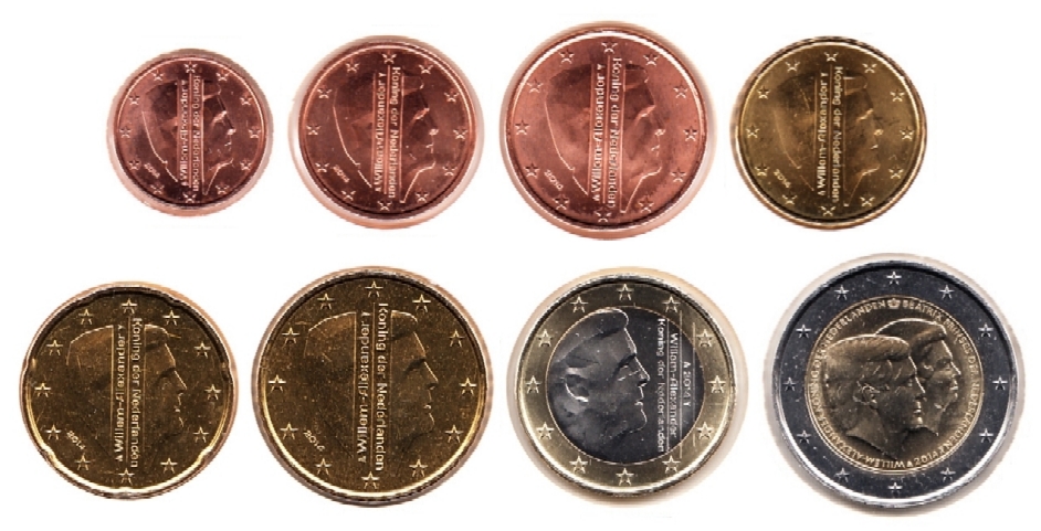 Der Münz-Satz besteht aus 8 Münzen: je 1 x 1, 2, 5, 10, 20, 50 Eurocent und je 1 x 1 & 2 Euro mit dem Doppelporträt Willem-Alexander und Beatrice.