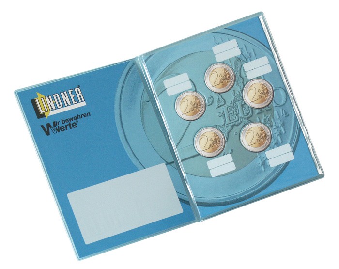 Taschenalbum für die Unterbringung von fünf Stück 2 Euro-Gedenkmünzen. Die Münzen können auf den neutralen Beschriftungsfeldern individuell gekennzeichnet werden z.B. mit Prägebuchstaben, Bundesland, Jahreszahl oder Ausgabeland.